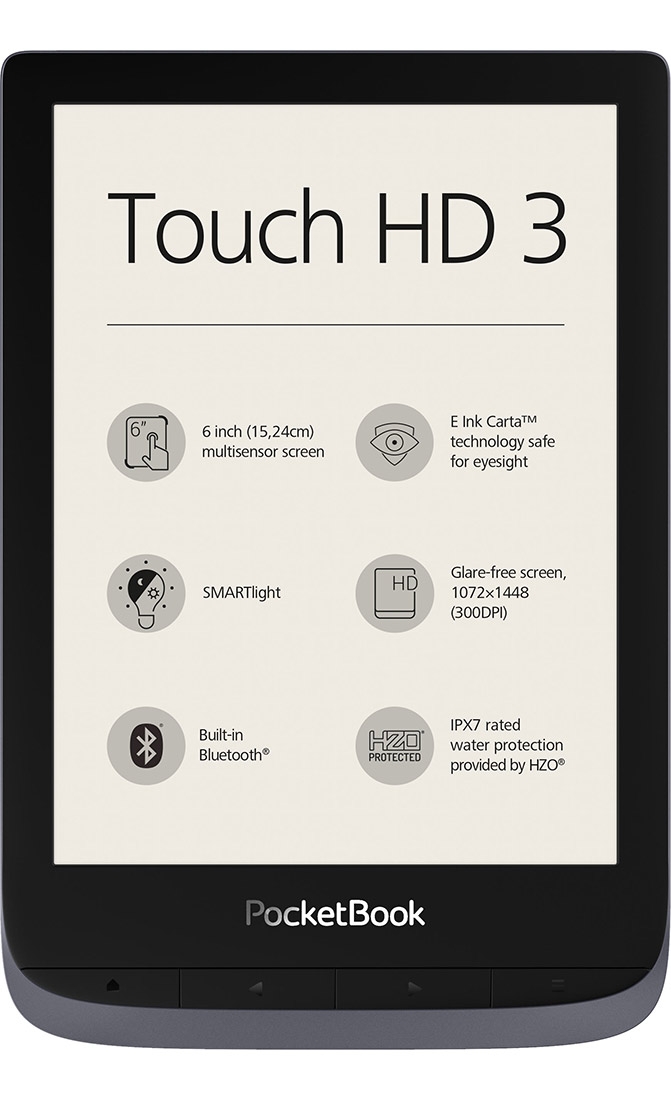 PoketBook touch HD 3 to nowa jakość w nietuzinkowej srebrnej odsłonie. Najlepsze parametry, innowacyjna funkcjonalność i wszystko zamknięte w minimalistycznej, wodoszczelnej obudowie. Doskonały wybór dla wymagającego e-czytelnika.