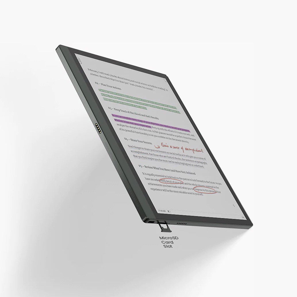 Bez względu na to, czy wyświetlasz wykresy, diagramy czy grafy, łatwo rozróżnisz kolory i uchwycisz kluczowe punkty za pomocą dostępnych podkreśleń i notatek odręcznych. Wbudowane 128 GB pamięci wewnętrznej oraz slot na kartę microSD zapewniają nielimitowane miejsce na wszystkie Twoje książki, notatki i dokumenty.