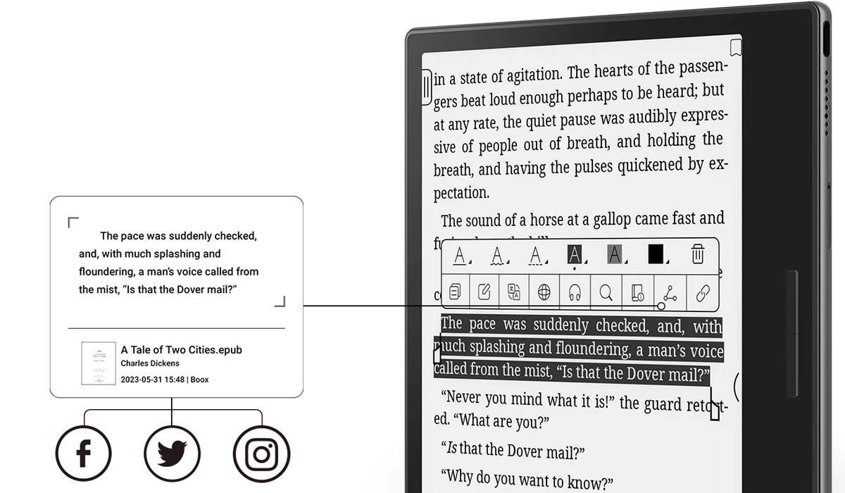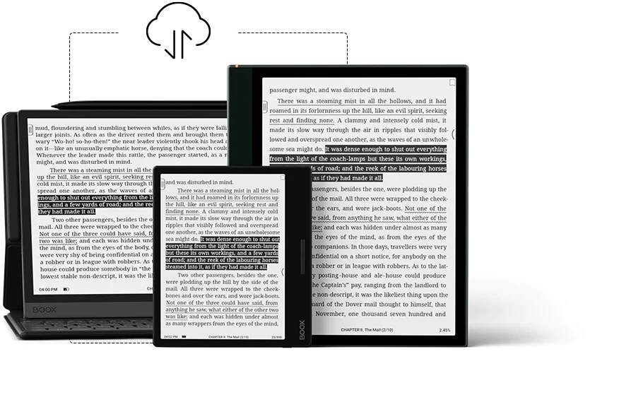 Podkreślenia i adnotacje można dodawać bezpośrednio w dowolnych obsługiwanych e-bookach. Po zarejestrowaniu się w chmurze Onyx możesz skorzystać z 10 GB bezpłatnej przestrzeni dyskowej, aby zsynchronizować wszystkie swoje dane czytania z innymi urządzeniami BOOX lub przeglądać je online.*