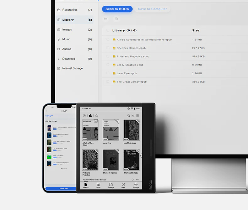 Pamięć wewnętrzna jest wystarczająco pojemna, aby pomieścić wszystkie e-booki i komiksy w każdym popularnym formacie, w tym EPUB, MOBI, PDF, CBR i wiele innych. Ilość pamięci można dodatkowo rozszerzyć za pomocą kart microSD lub pendrive’a USB-C, a także wykorzystać pamięć chmurową firm zewnętrznych, jak Google Drive, Dropbox i OneDrive.