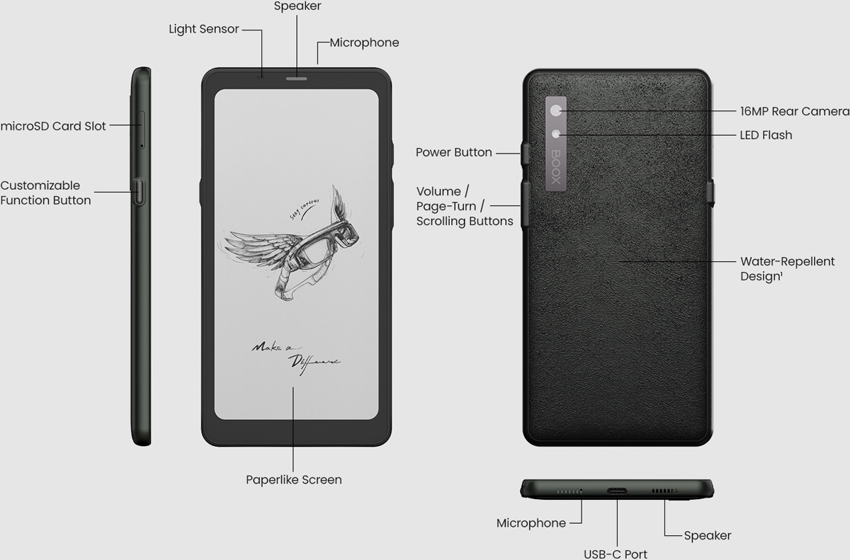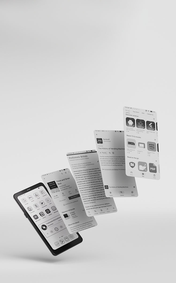 Innowacyjny koncept urządzenia mobilnego, które łączy w sobie najnowocześniejszą wydajność z wyświetlaczem E Ink i konstrukcją wielkości telefonu, dzięki czemu możesz wsunąć go do kieszeni i komfortowo transportować.