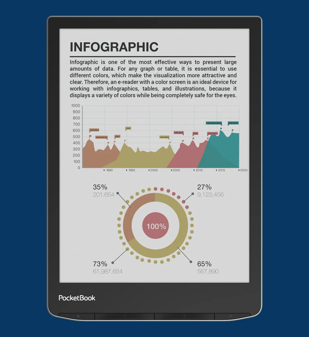Duży, bezpieczny dla oczu, kolorowy ekran, to gratka dla każdego czytelnika kolorowych książek. Obsługa najpopularniejszych formatów ebooków, wydajne podzespoły czy intuicyjny interfejs. PocketBook InkPad Color 3 to idealne dopełnienie każdej domowej biblioteki. Oferuje przyjemną lekturę bajek dla najmłodszych, komiksów, lektur i dokumentów PDF.