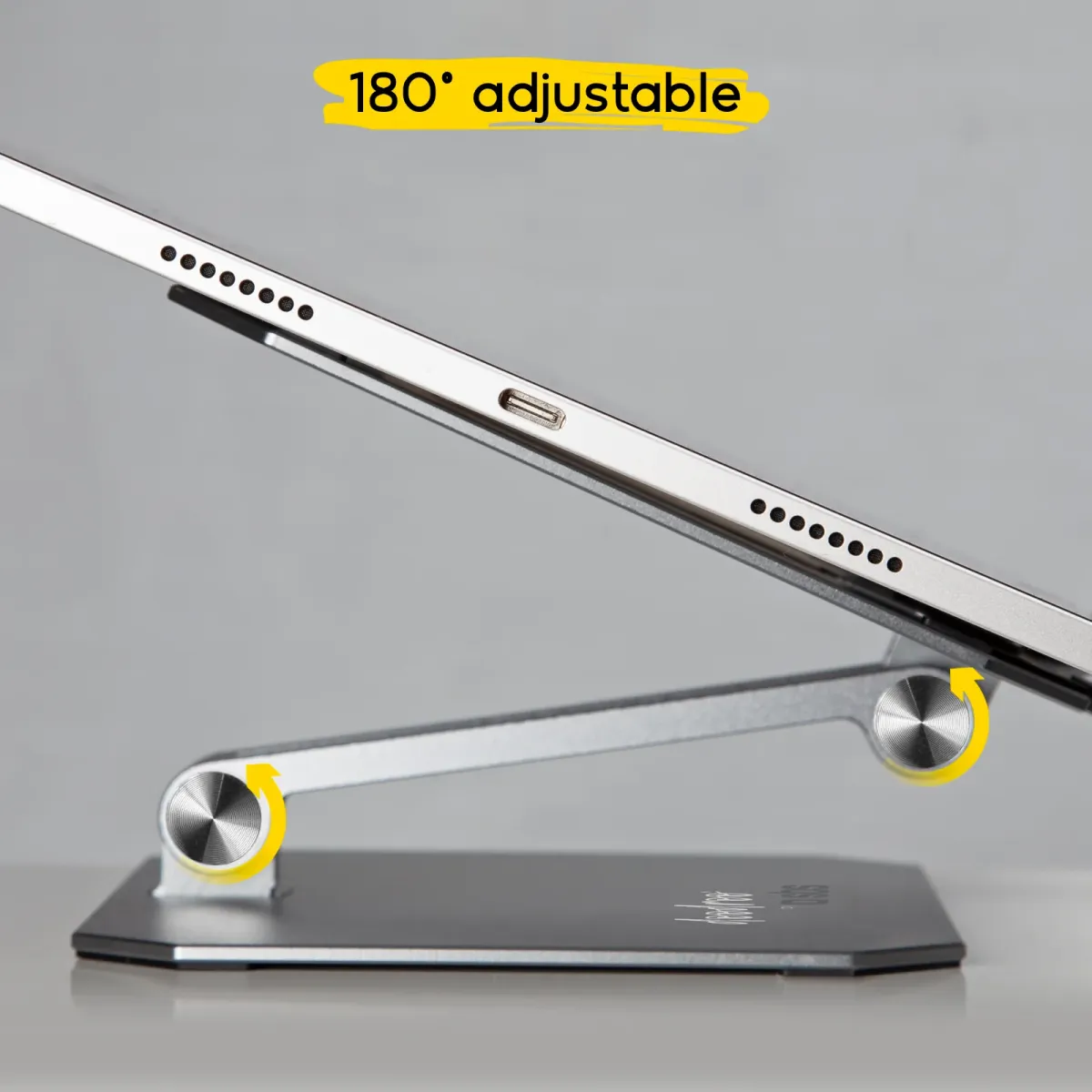 Stojak posiada składane ramię, które można odchylić o 180°. Pozwala to na umieszczenie notatnika e-ink lub e-czytnika na preferowanej wysokości. Dzięki otwartej budowie, e-czytnik czy tablet można umieścić zarówno w pozycji poziomej jak i pionowej. Stojak posiada eleganckie grafitowo aluminiowe wykończenie, dzięki czemu jest trwały i stanowi elegancki przedmiot, zarówno w domu, jak i w biurze.