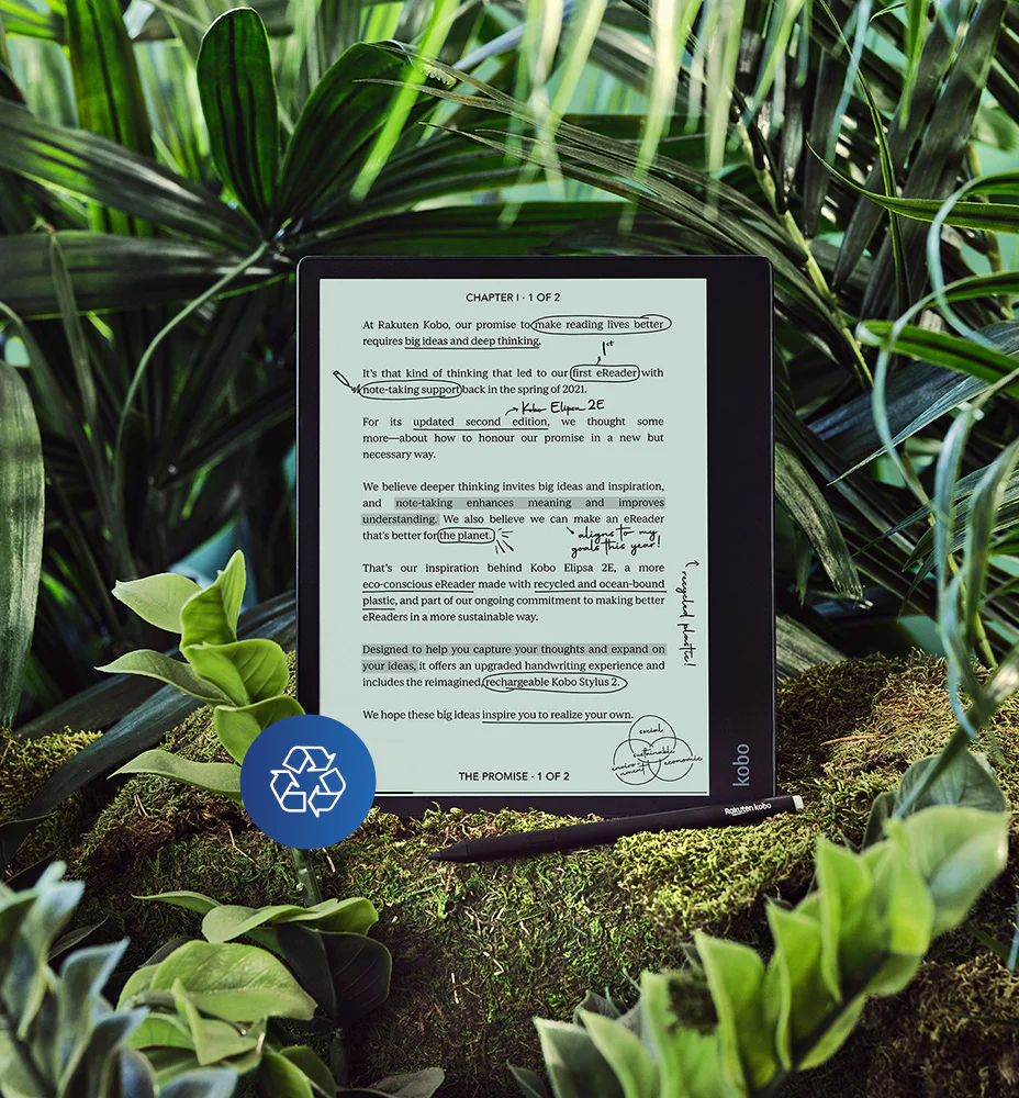 Pisz bezpośrednio w e‑bookach i plikach PDF*, korzystając z ulepszonych funkcji Kobo Elipsa 2E. Twórz i organizuj notatniki, które potrafią więcej niż papier, a potem eksportuj je dzięki zintegrowanym usługom chmurowym. Wygodnie czytaj i pisz na ekranie dotykowym o przekątnej 10,3” wyposażonym w technologię ComfortLight PRO, która pomaga zredukować ilość niebieskiego światła i nie nadwyręża oczu. Słuchaj audiobooków Kobo dzięki bezprzewodowej technologii Bluetooth**. Dzięki 32 GB pamięci możesz mieć całą swoją bibliotekę i wszystkie notatki zawsze pod ręką. Nasz ekologiczny czytnik Kobo Elipsa 2E został wykonany z recyklingowanego plastiku odzyskanego z oceanów. Z pomocą czytnika uchwycisz wszystkie swoje ważne myśli.